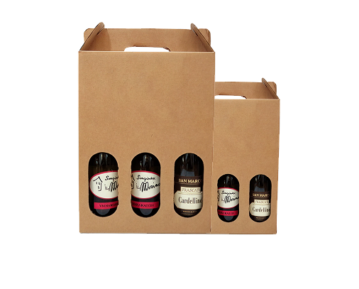 - Durable wine carriers made from ECT32 rated Kraft corrugated cardboard